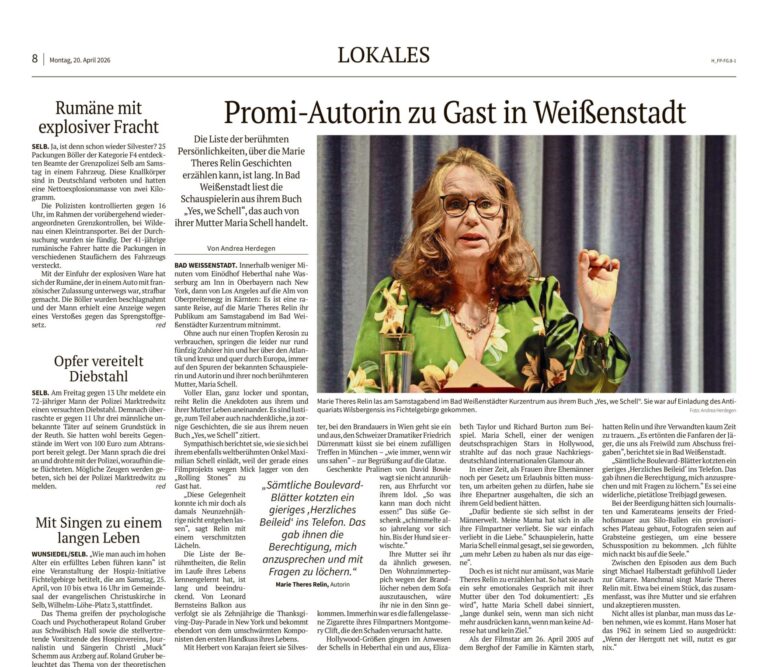 November 2018. „Liebe Hannelore, Nils Dünker sagte mir, Du drehst gerade in Wasserburg? Ich wohne dort! Sehen wir uns?“ Es dauerte keine halbe Stunde und ich erhielt einen Anruf von ihr. „Marie Theres! Du weißt doch, ich hab so ein altes Handy, so eins, wo man alte SMS löschen muss, damit man neue empfangen kann. Nur Deine liebe Geburtstags-SMS konnte ich nicht löschen, behielt sie, dachte an Dich und löschte andere. Kaum war der Speicher frei, kam Deine Nachricht. Verrückt nicht?“