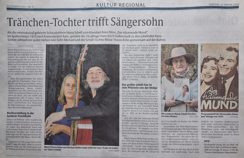 Marie Theres Relin kam im Dezember 2021 mit einer musikalischen Lesung und dem Kölner Flötenquartett Flautando. Damit war Kaiserslautern ins Tour-Programm aufgenommen. Ihr Gastspiel am 18. Januar in der Fruchthalle ist bereits der fünfte Auftritt bei uns. Zusammen mit dem Kaiserslauterer Kulturpreisträger Michael Halberstadt singt Marie Theres Relin unter anderem die sentimental-rührseligen „Tränenlieder“, die schon ihre Eltern aufgenommen haben – eine ironische Anspielung auf Maria Schells Image als schicksalsgeplagtes „Seelchen“. Im Übrigen ist das Duo Relin & Halberstadt viel unterwegs. Nach dem Auftritt im Lauterer Stadtmuseum sind unter anderem Stippvisiten in der SWR-„Landesschau“, bei der Münchner Lach- und Schießgesellschaft, im Bayerischen und Westdeutschen Rundfunk sowie in Wien und Leipzig geplant.