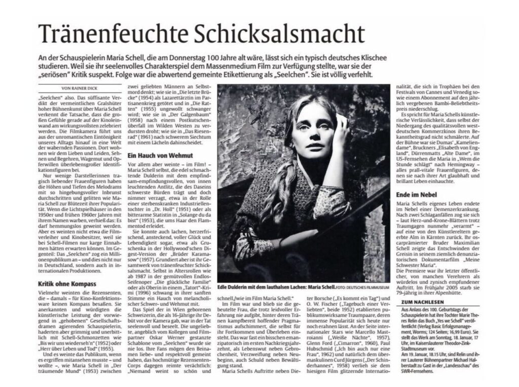 Die Rheinpfalz – Tränenfeuchte Schicksalsmacht Beitrags-Autor:region18 Beitrag veröffentlicht:17. Januar 2026 Beitrags-Kategorie:News / Presse / Presse 2026 Von Rainer Dick, erschienen in DIE RHEINPFALZ am 14.01.2026 Foto: Quelle DFF / Nachlass Maria Schell Das könnte dir auch gefallen Chiemgau Zeitung / OVB – Ein Farbtopf voll Leben 20. Oktober 2021 Schneider Press – Fotos vom Kinofest mit Barbara Wussow 15. September 2022 Park-Kino-Betreiber: „Ich breche innerlich auseinander“ 29. November 2021