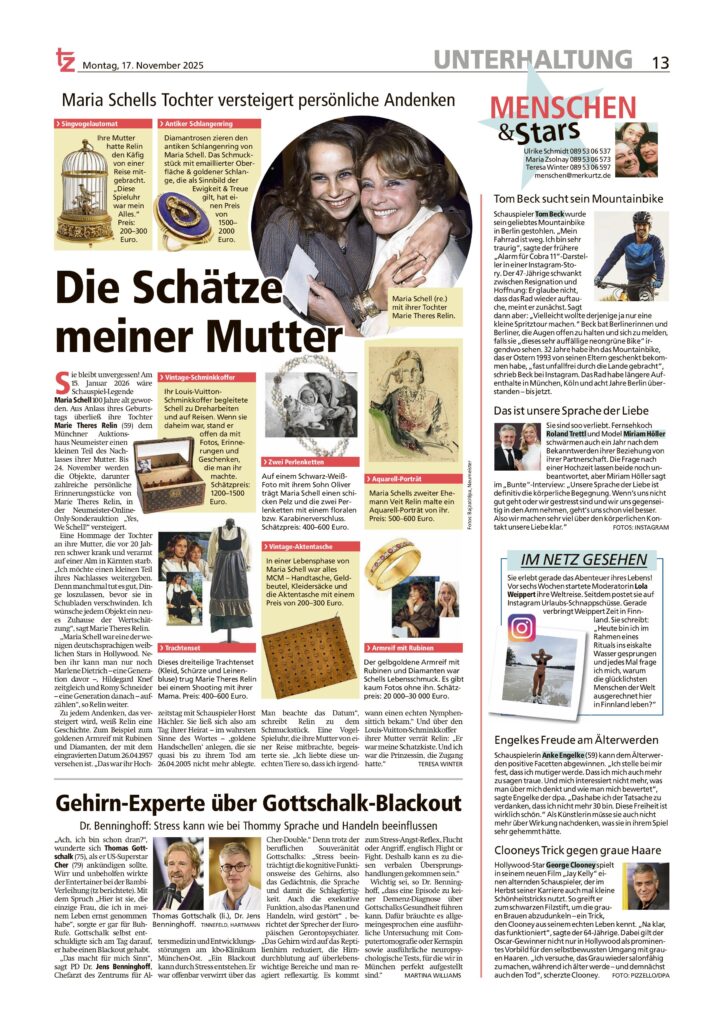 TZ – Die Schätze meiner Mutter Beitrags-Autor:region18 Beitrag veröffentlicht:18. November 2025 Beitrags-Kategorie:News / Presse / Presse 2025 Erschienen am 17.11.2025 in TZ München. Titelfoto © Frédéric de Lafosse / Archiv Marie Theres Relin Das könnte dir auch gefallen DIE ZEIT – Volker Weidermann – Autofahrt ins Schweigen 5. Oktober 2023 Kino Frauen aller Kulturen in EICHENAU – 21.Nov.2024 & Vorschau 8. November 2024 Süddeutsche Zeitung – Christine Dössel über die Buchpremiere: Sie schenken sich nichts 18. Oktober 2023