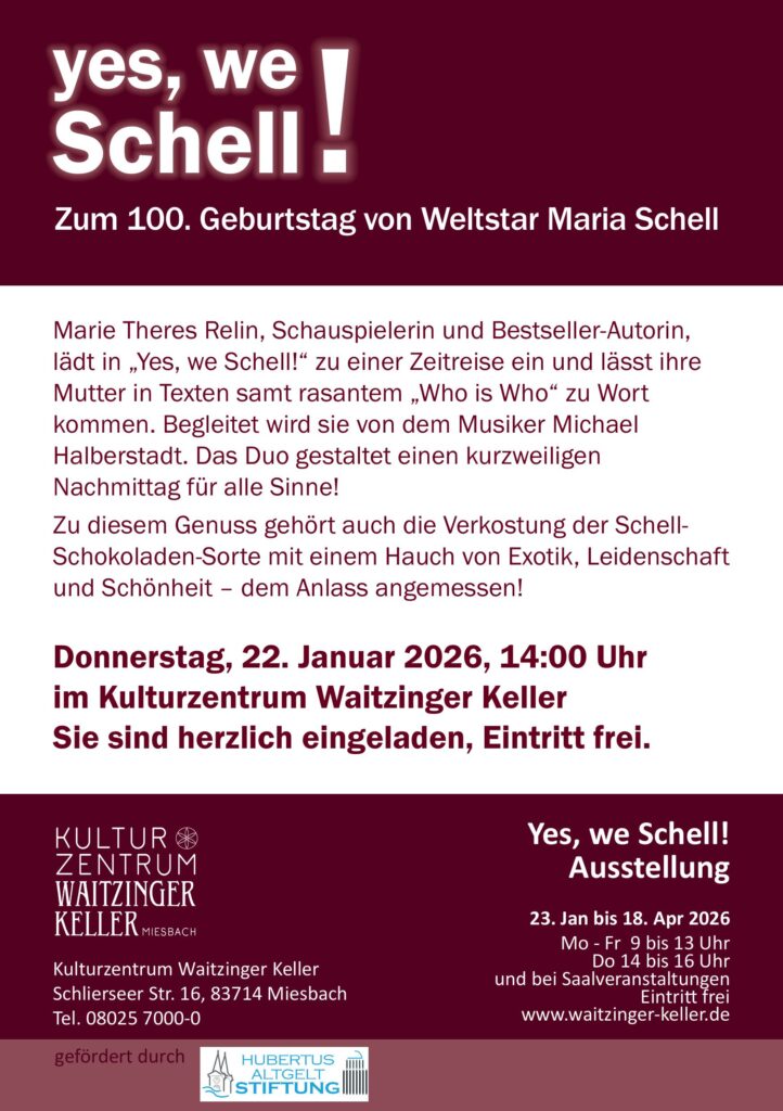 Marie Theres Relin, Schauspielerin und Bestseller-Autorin, lädt in „Yes, we Schell!“ zu einer Zeitreise ein und lässt ihre Mutter in Texten samt rasantem „Who is Who“ zu Wort kommen. Begleitet wird sie von dem Musiker Michael Halberstadt. Das Duo gestaltet einen kurzweiligen Nachmittag für alle Sinne! Zu diesem Genuss gehört auch die Schell-Schokoladen-Sorte mit einem Hauch von Exotik, Leidenschaft und Schönheit – dem Anlass angemessen.